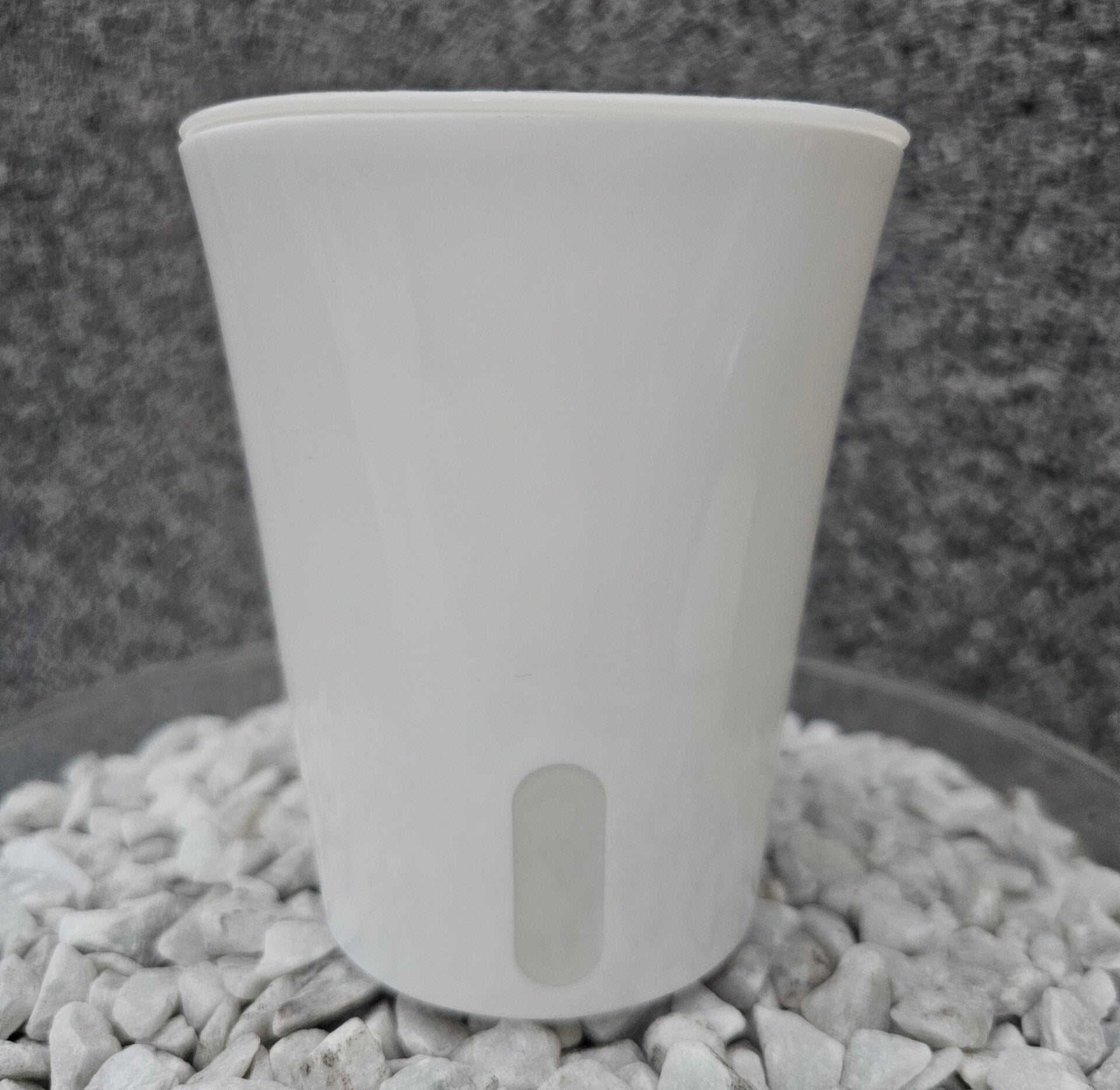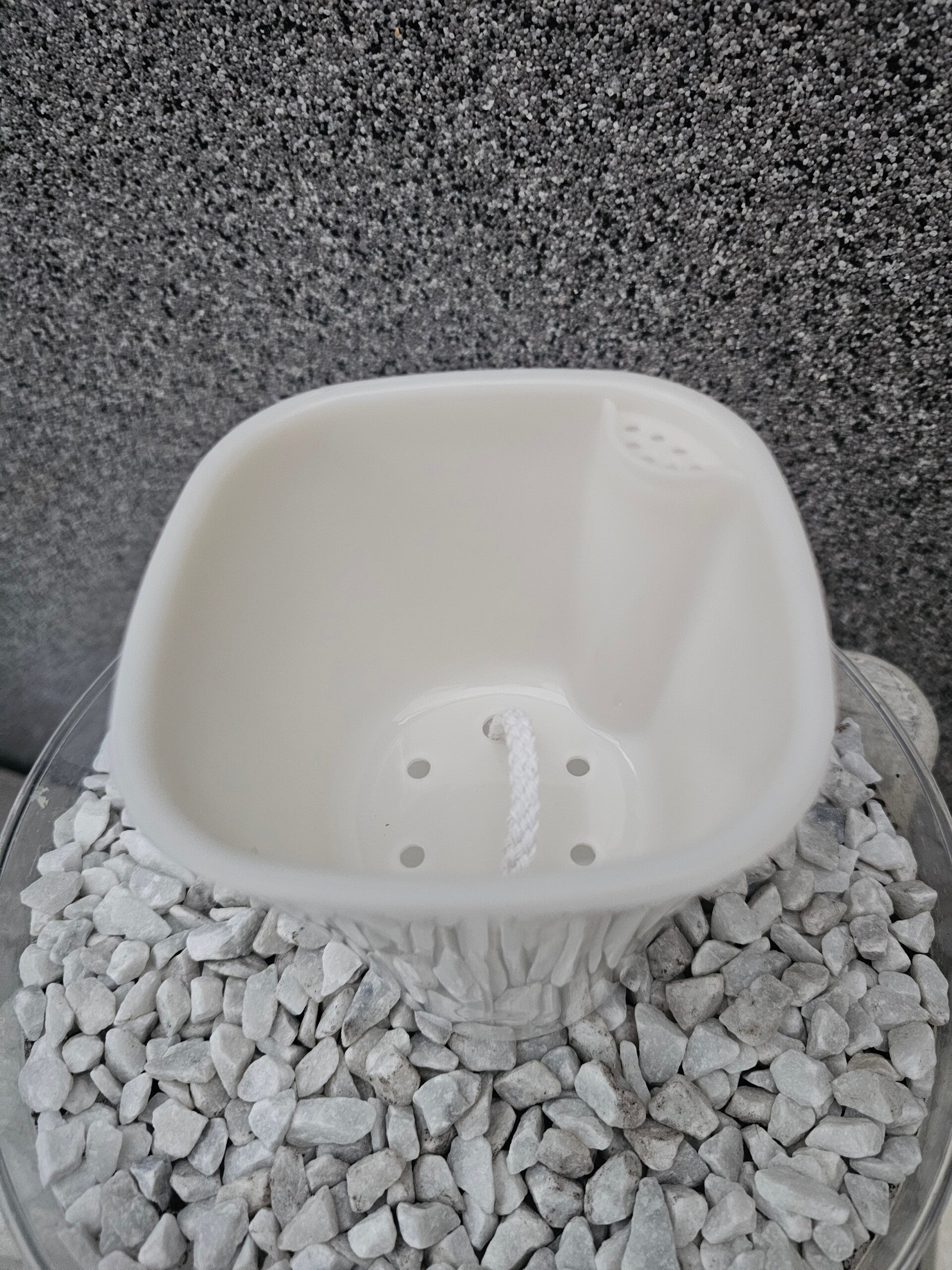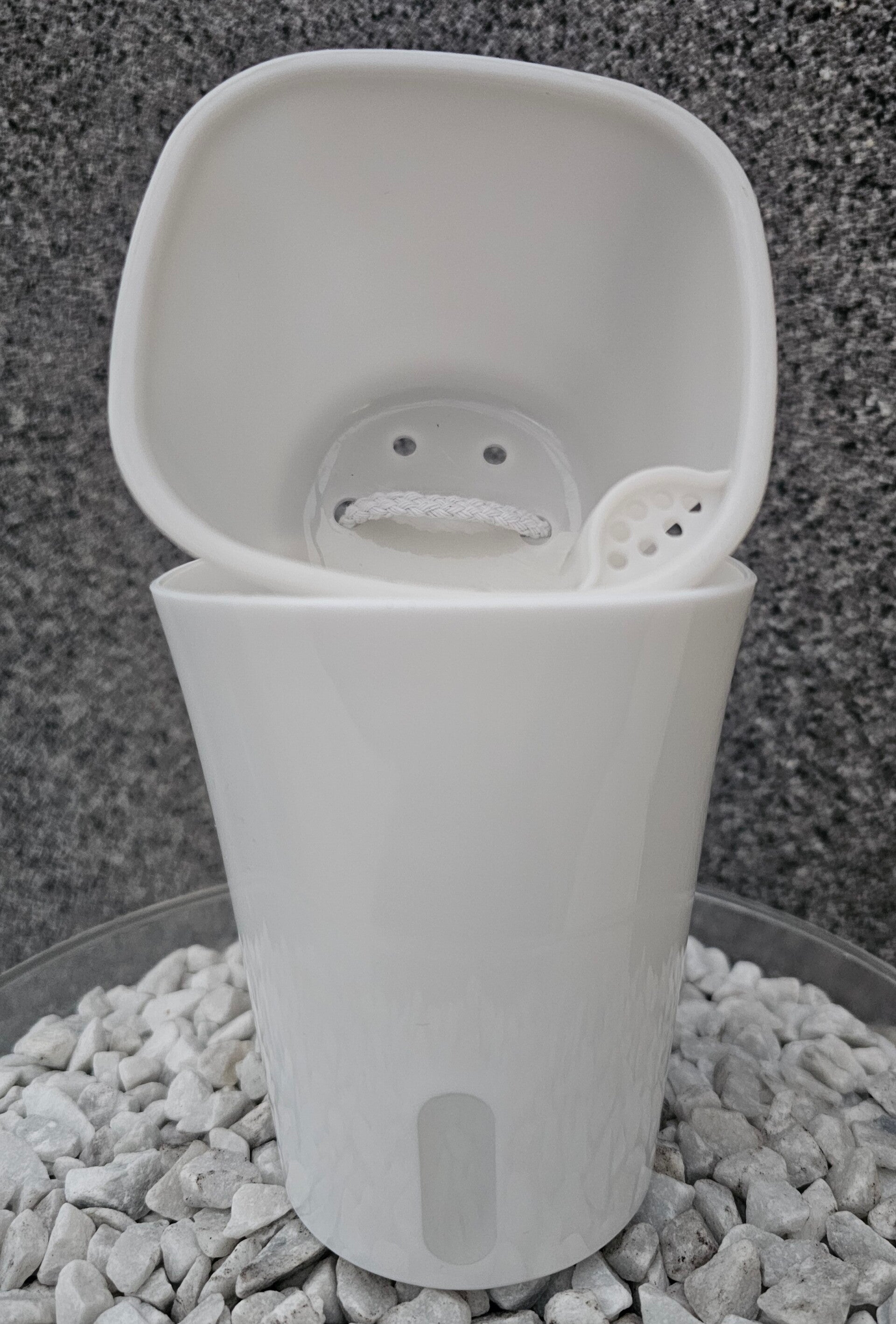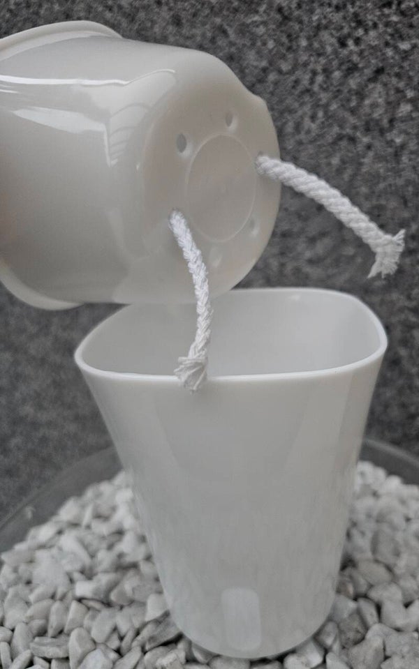 Dieser Topf ist farblich weiss mit Schnur zur Selbstbewässerung besteht aus 3 Teilen.