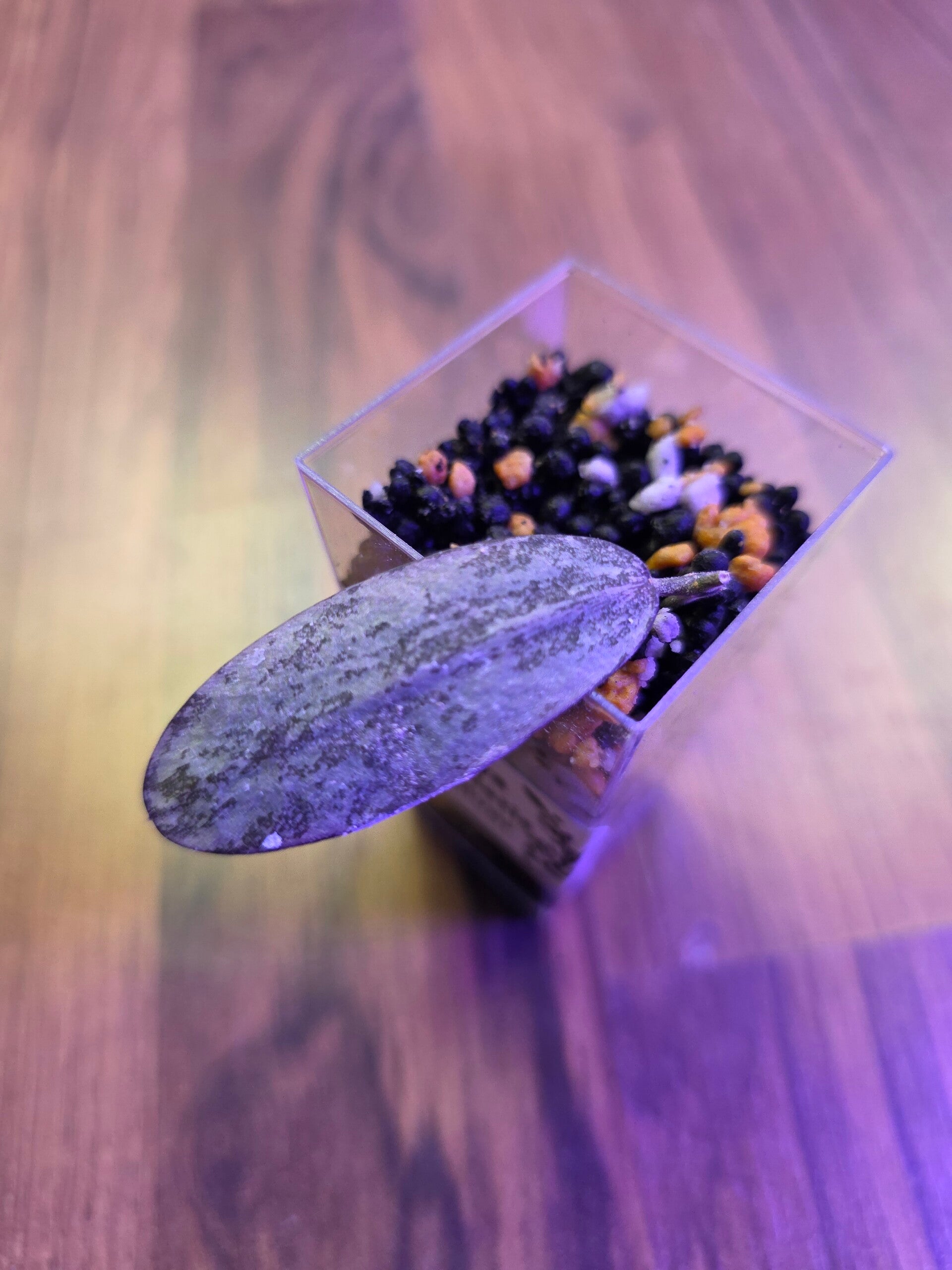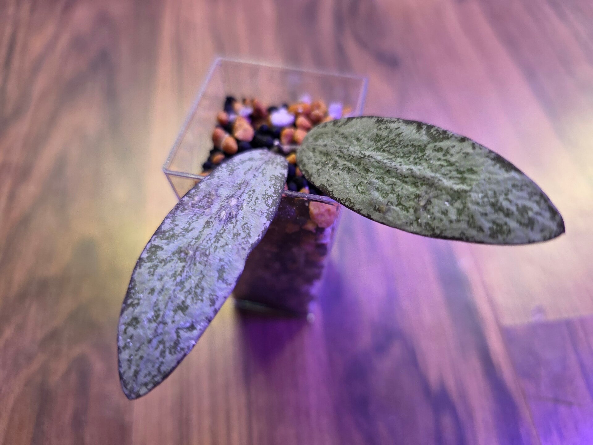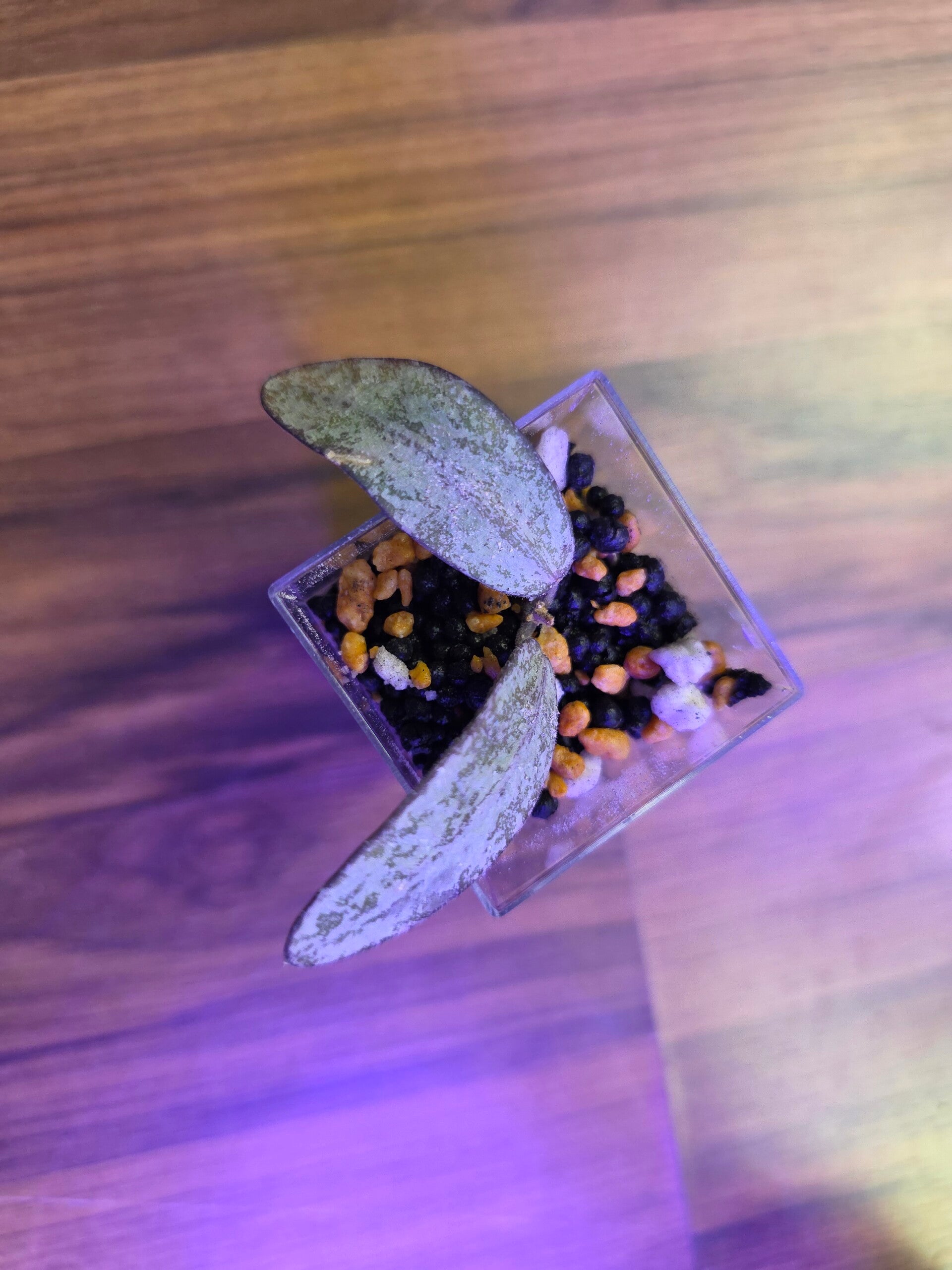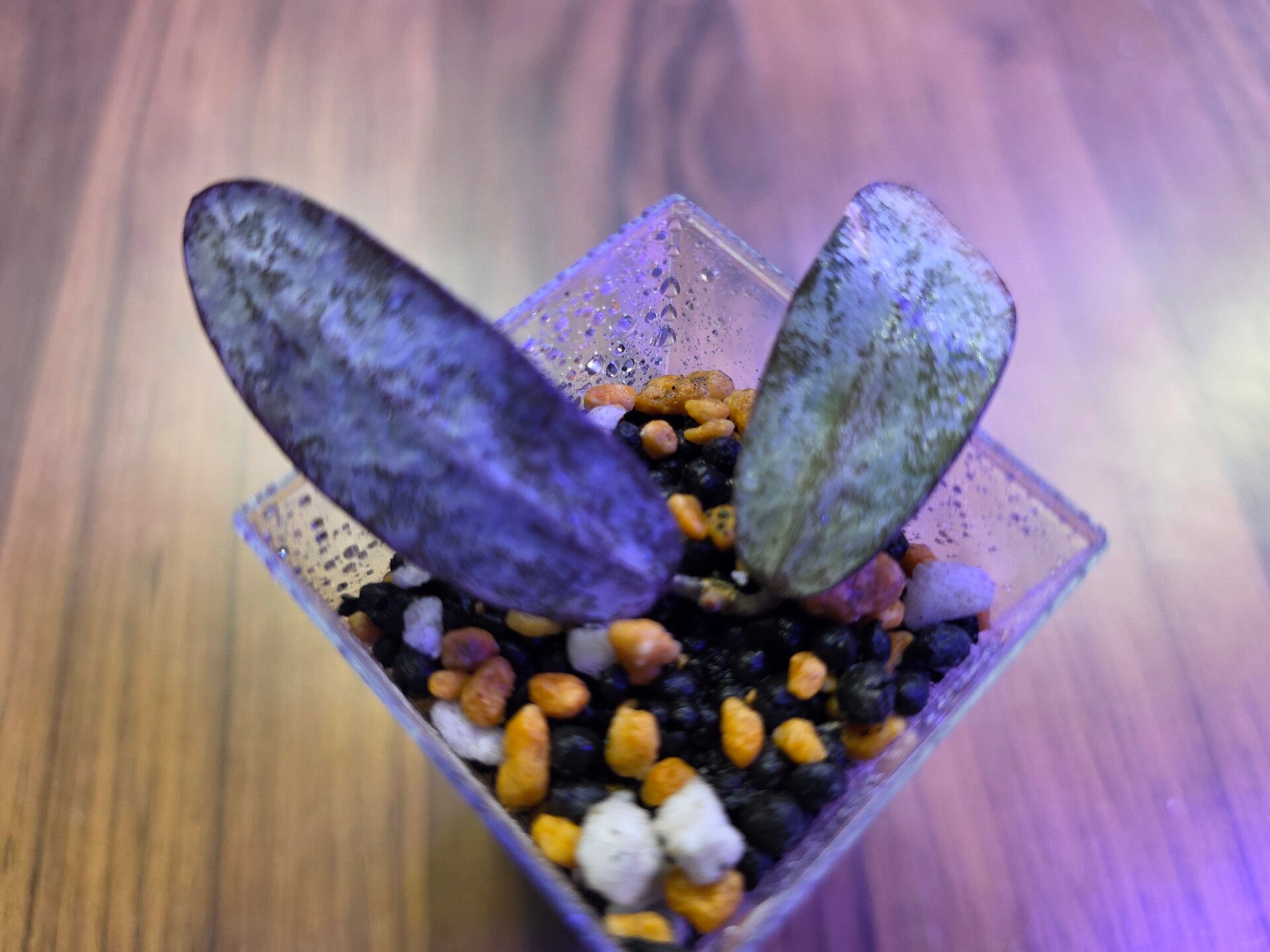 Die Stecklinge wurden im Wasser bewurzelt und stehen jetzt im Acrylbecher mit Stratum/Kanuma.