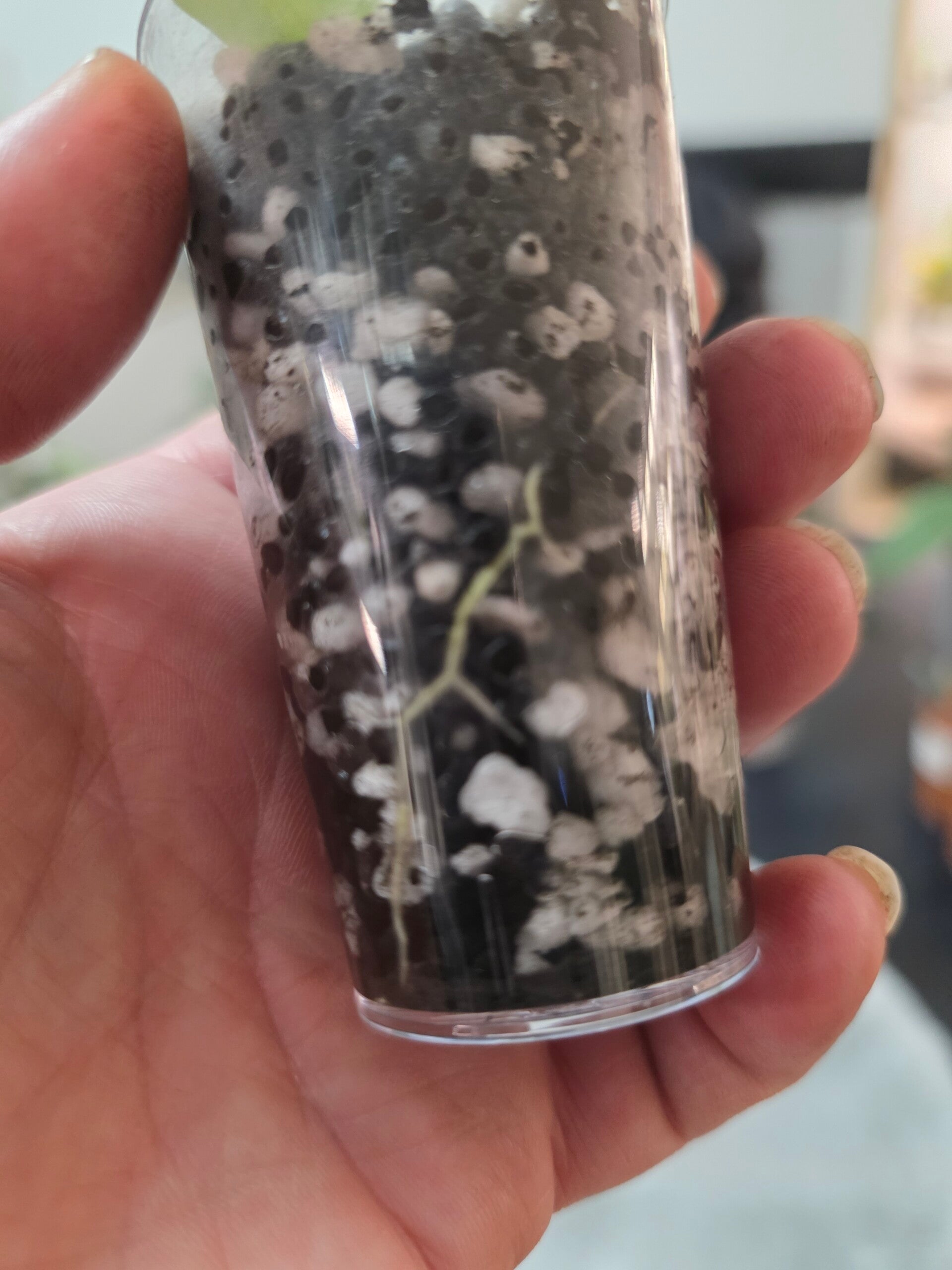 Der Steckling ist bewurzelt hat ein leider abgebrochenes Blatt aber wächst aktiv und hat inzwischen ein neues Blatt.