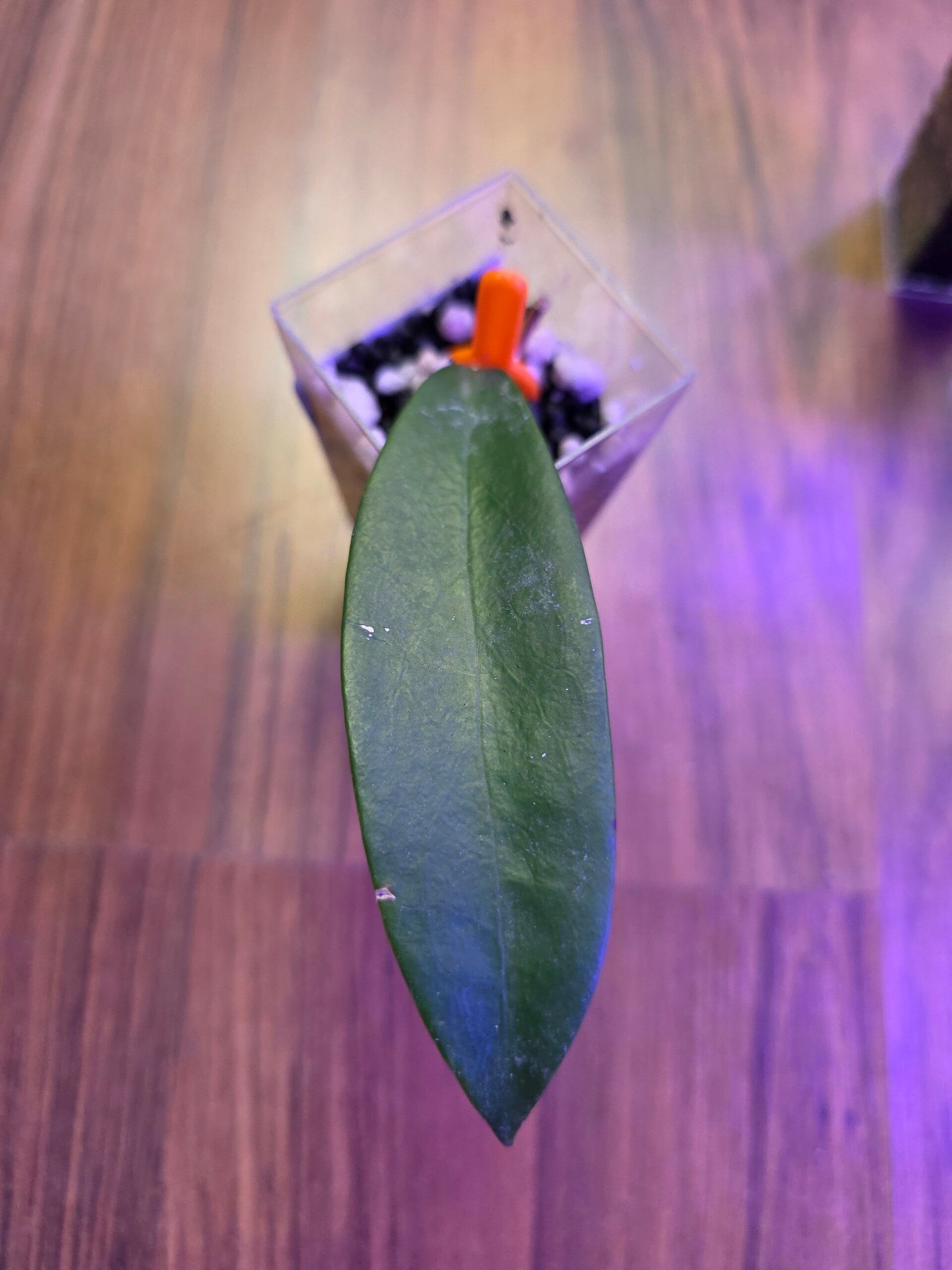 Der Steckling ist bewurzelt und hat je 1 Blatt steht in einem Acrylbecher mit Stratum und Kanuma.