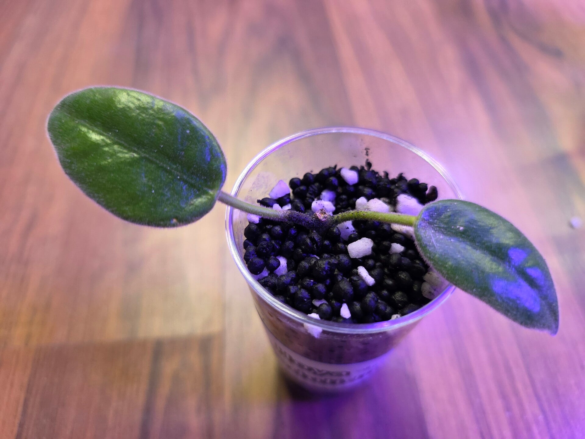 Der Steckling ist bewurzelt und hat 2 Blätter, steht in einem Acrylbecher mit Stratum und Kanuma.